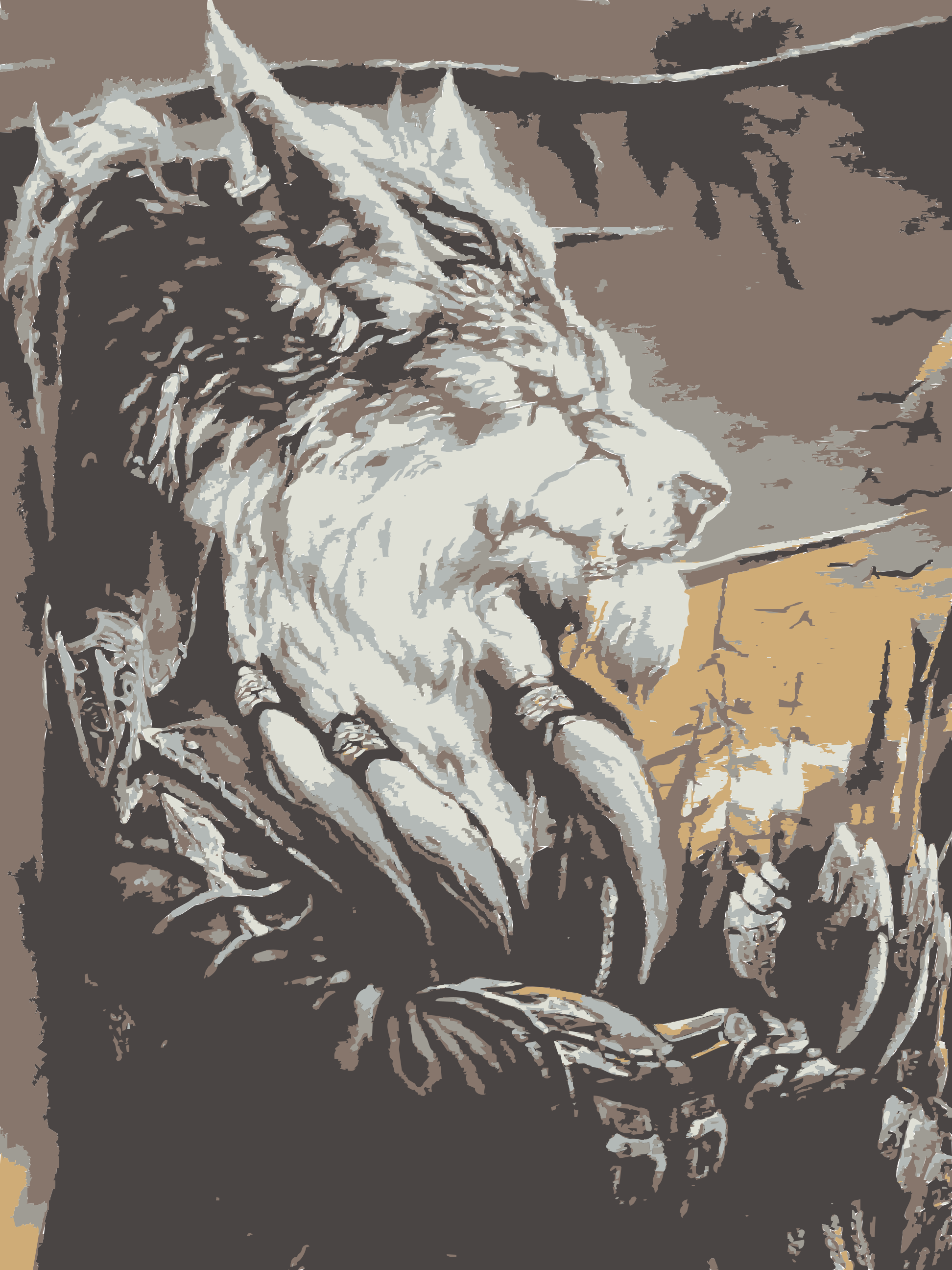 This features a wolf with its mouth open, giving the impression of being very angry or aggressive. It appears to be wearing a black jacket and has large teeth, which adds to its menacing appearance. The wolf's face is prominently displayed in the foreground, while other elements such as trees can be seen in the background. This artistic representation of a wolf creates an intense atmosphere that captures the viewer's attention.