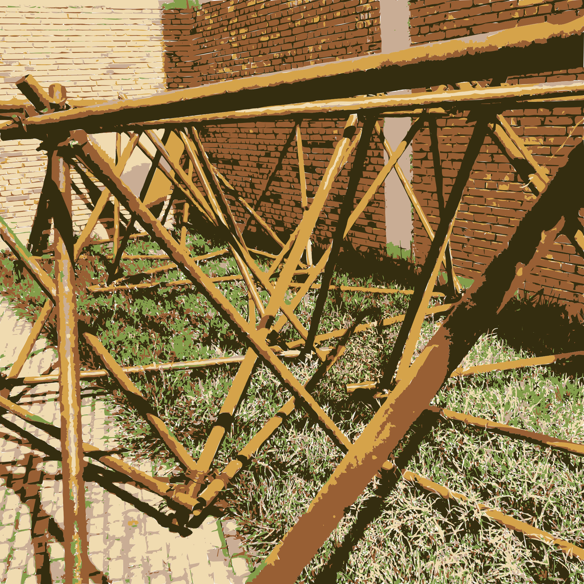 This features a large metal structure, possibly an antenna or part of a building under construction. It is made up of several wooden beams and metal bars that are arranged in various positions. Some of the wooden beams appear to be connected with metal bars, creating a unique combination of materials for this structure. The scene takes place outdoors, possibly on a brick walkway or near a building under construction. The presence of multiple wooden beams and metal bars suggests that this is an ongoing project, likely related to the construction industry. The overall appearance of the image gives off a sense of progress and development in the area.