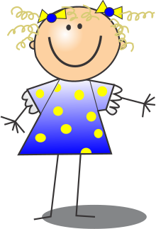 This features a smiling stick figure of a girl wearing a blue dress with yellow polka dots. She is standing in front of a white background, giving her a cheerful and lively appearance. Her outfit consists of a blue top and matching skirt, along with the yellow polka dots that add a playful touch to her overall look. The stick figure's facial expression conveys happiness and friendliness, making it an appealing and positive image.