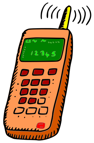 This features a hand-drawn sketch of an old model, analogue mobile phone. It is depicted in a cartoon style with a red and orange color scheme. The cellphone has a calculator function on the front, which adds to its vintage appearance. The drawing captures the essence of a classic mobile device from a bygone era, showcasing its unique design elements and features.