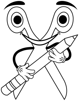 This features a cartoon character holding a pair of scissors in its hands. The character is smiling and appears to be enjoying the activity. The scissors are prominently displayed, with one end pointing upwards and the other downwards. This creative design could potentially be used as a logo for a coloring book or another art-related product.