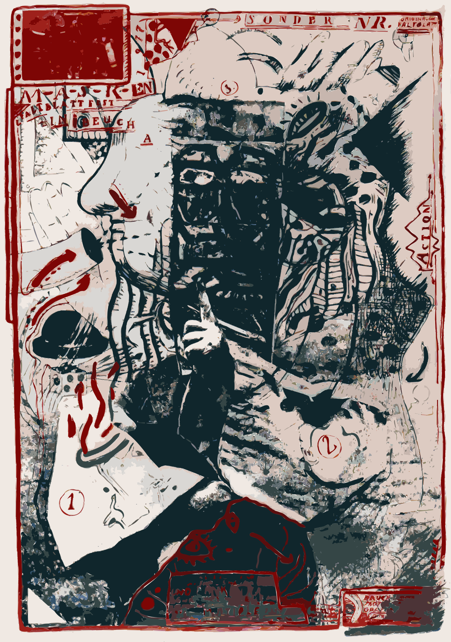 This is a black and white drawing of a person's face, with the mouth open. It appears to be an artistic representation or a sketch of a man's head. The drawing has been altered in some way, giving it a unique appearance. There are also several numbers scattered throughout the drawing, which might indicate that this is part of a series or a specific project. Overall, the image showcases creativity and an artistic approach to depicting a human face.