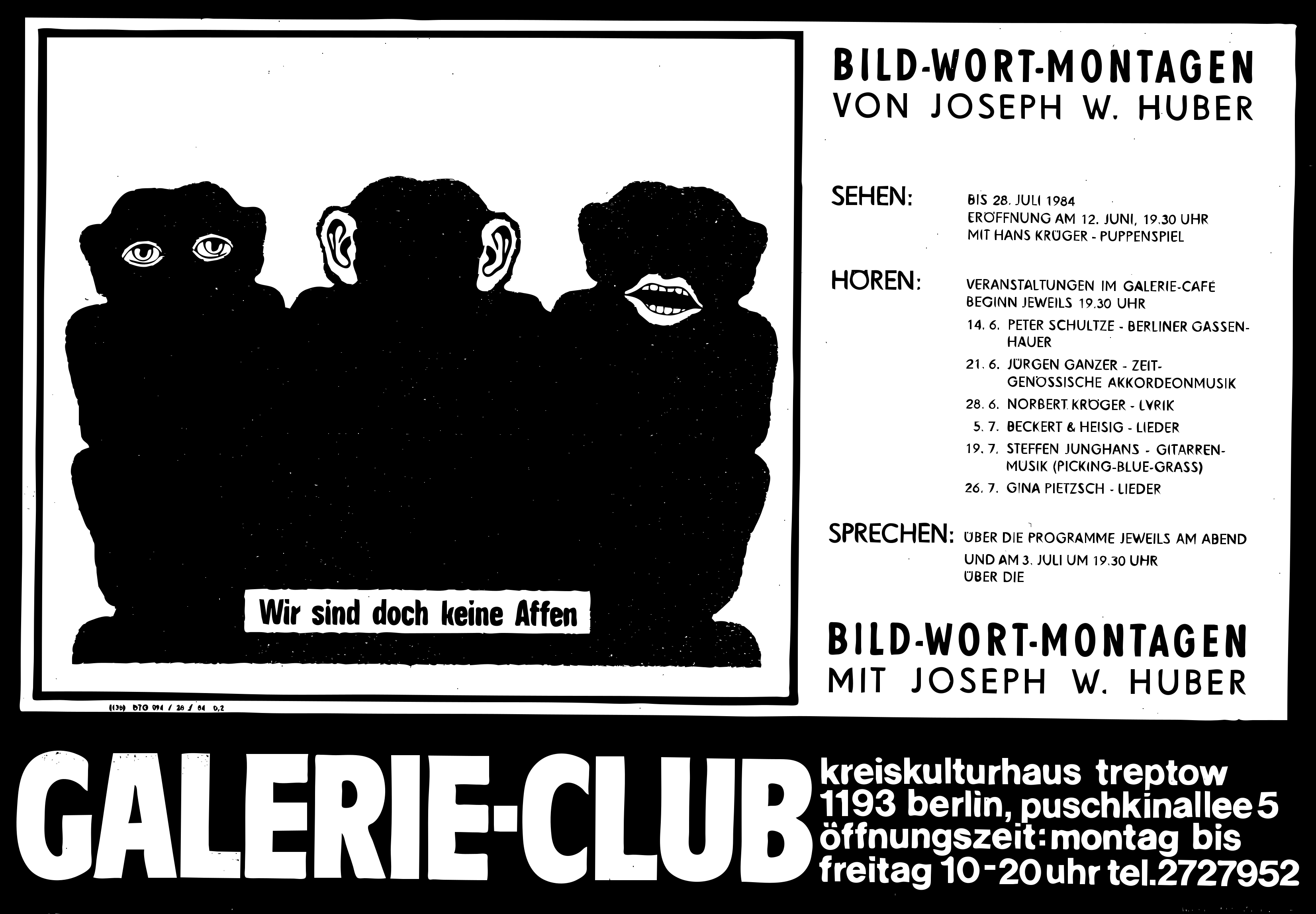 This is a poster advertising an event at the Galerie Club in Berlin. It features four monkeys sitting on chairs, with one monkey on each chair. The poster is written in German and appears to be black and white. The text on the poster reads "Galerie-Club" and "Wir und Dotsch laehen auf die Fiiren." There are also several other words scattered throughout the poster, but they do not seem to convey any specific information about the event.
