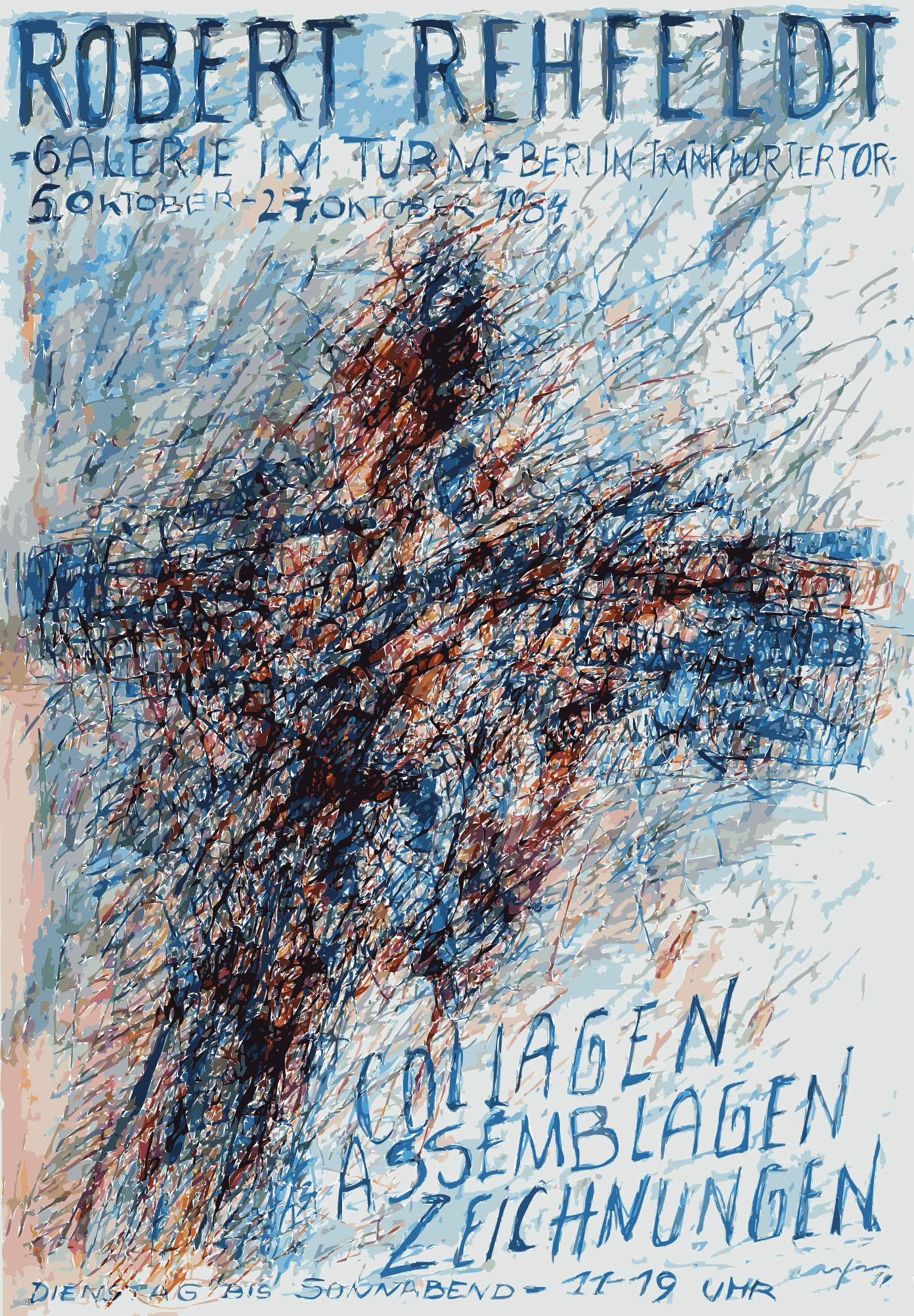This is a poster featuring the name "Robert Rehfeldt" in bold letters. Below his name, there are two dates: one from 1984 and another from 1993. The poster appears to be an artistic piece with a mix of colors and textures, giving it a unique visual appeal. It is likely that the artist's work has been featured in various exhibitions or events over the years, as indicated by the two dates on the poster.