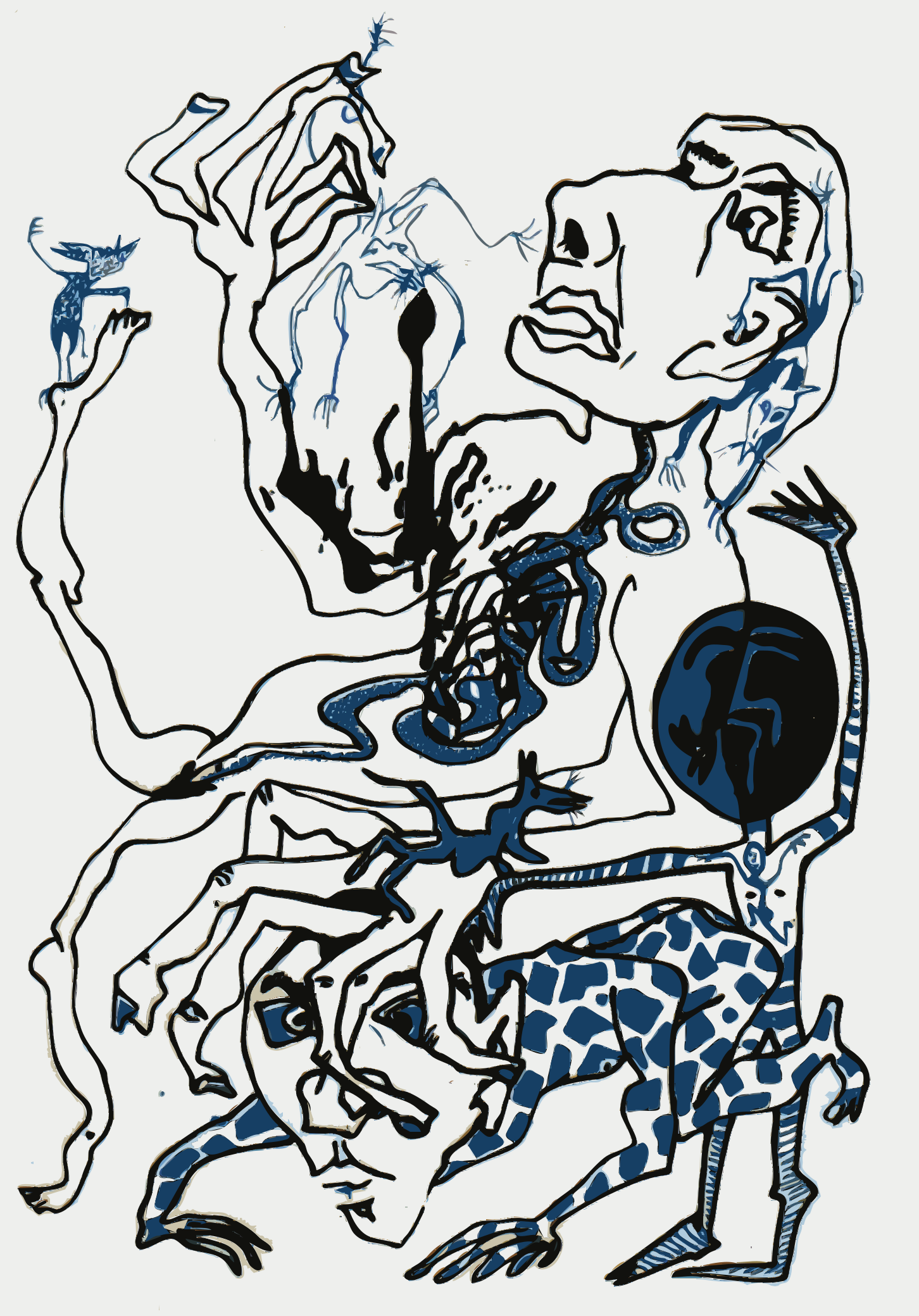This features a black and white drawing of a man with an animal head, possibly a dog or a cat. This unique creature is holding a bottle in its mouth while standing next to another person who appears to be wearing a tie. There are also two birds present in the scene, one located near the top left corner and the other towards the bottom right side of the image. The drawing seems to depict an interesting and unconventional interaction between humans and animals.