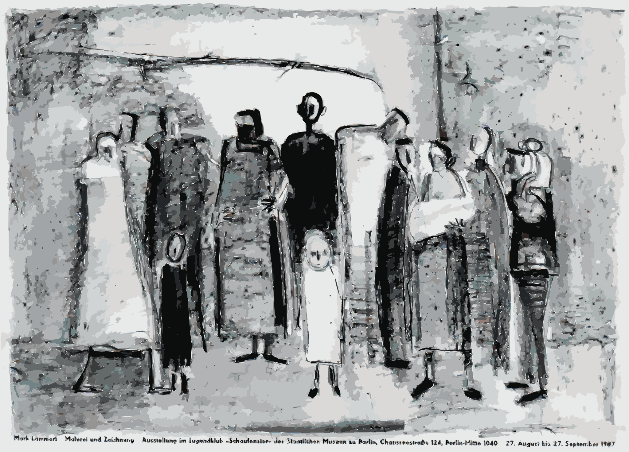 This is a black and white drawing of a group of people standing next to each other. There are at least 12 individuals in the scene, with some standing closer together while others maintain a bit more distance from one another. They appear to be posing for a picture or simply gathered in a public space. The drawing is quite detailed and captures various expressions and body language of the people present. Some are looking towards the camera, while others seem to be engaged in conversation with each other. The overall atmosphere appears to be friendly and social, as if they are attending an event or simply enjoying a day out together.
