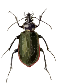 This features a close-up of a green and red bug with six legs. It appears to be an insect, possibly a Fiery Searcher Bug, as it is described in one sentence. The bug's coloring is quite vibrant, making it stand out against the white background. Its legs are clearly visible, adding detail to the overall composition of the image.