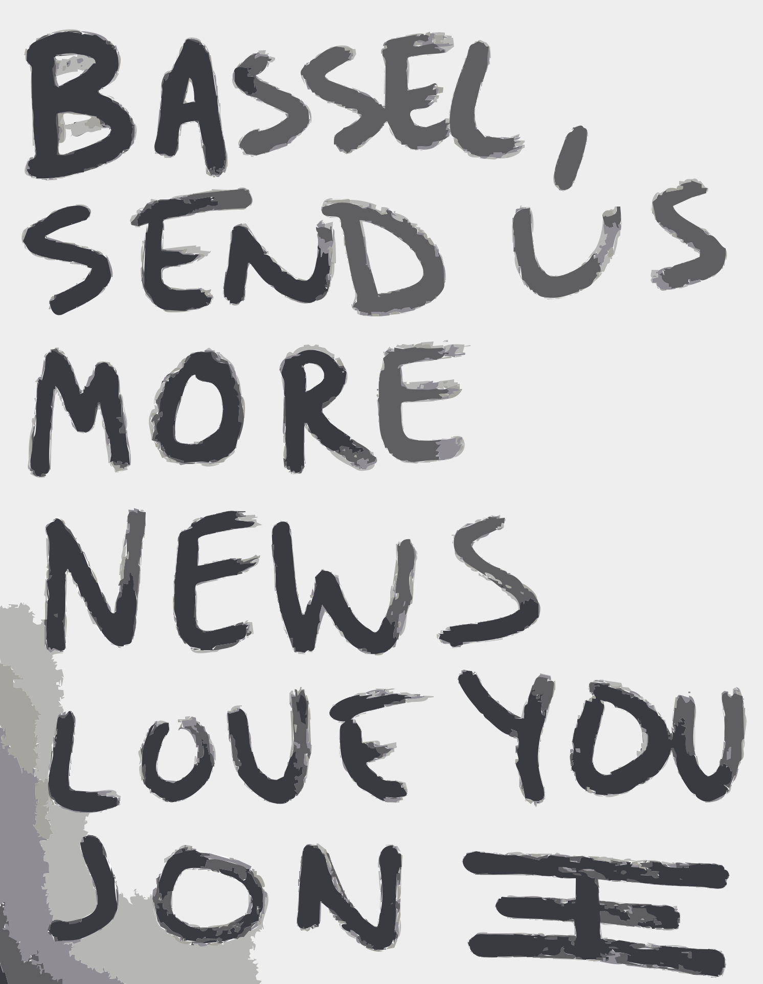 This is a handwritten sign that reads "Bassel, send more news to us. You love Jon." It appears to be written in black marker on a white background. The message seems to be directed towards someone named Bassel, who is being encouraged to share more news with the sender. The sender also expresses their affection for the recipient by signing off with "You love Jon."