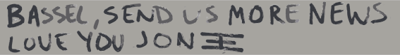 This is a handwritten note that reads "Bassel, send us more news. Love you Jon." This message appears to be written in a foreign language and has been translated into English for better understanding. It seems like the author of this note wants to express their love and support for someone named Bassel by asking them to share more news with them. The note is displayed on a brown background, which adds a sense of warmth and intimacy to the message.