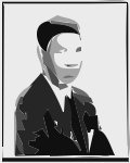 This is a black and white photograph of a man wearing a suit, tie, and jacket. He appears to be dressed in formal attire, possibly for an important event or occasion. The man's face is partially obscured by his tie, giving the impression that he might be hiding behind it. The photo has been edited to create a silhouette effect, emphasizing the contrast between light and shadow. This artistic choice adds depth and intrigue to the image, making it an interesting visual piece.