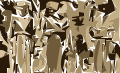 This is a black and white photo of several people standing next to each other. They are all wearing brown clothing, giving the scene an old-fashioned appearance. There are at least nine individuals in the picture, with some standing closer together while others maintain a bit more distance between them. The group appears to be posing for a photograph, capturing a moment of togetherness and camaraderie among these people.