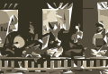 This is a black and white photograph of people sitting on benches. There are several individuals in the scene, some of them holding drums or other musical instruments. A few of these people appear to be playing music together, creating an atmosphere of camaraderie and shared enjoyment. The setting seems to be outdoors, with a fence visible in the background. The benches are arranged in such a way that they face each other, allowing for easy interaction between the individuals seated on them. Overall, the image captures a moment of community and creativity among these musicians.