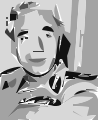 This is a black and white photo of a man with a mustache, wearing glasses. He appears to be looking at the camera while sitting in front of a window. The man's facial expression seems somewhat serious or contemplative. The photograph has been edited to create an artistic effect, giving it a vintage appearance.