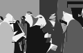 This is a black and white photo of several people standing together. They are all wearing masks, which adds an interesting element to the scene. There are at least nine people in total, with some standing closer to the foreground while others are further back. The group appears to be engaged in conversation or attending an event where masks are required. The overall atmosphere of the photo is somewhat mysterious due to the black and white color scheme and the presence of masks on the faces of the individuals.