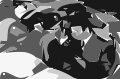 This is a black and white drawing of two men sitting next to each other. They are both wearing ties, which suggests that they might be dressed for a formal occasion or event. One man appears to be looking down while the other looks upwards, possibly engaging in conversation or observing something. The scene has an artistic quality to it, with the two men being the main focus of the image.