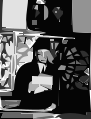 This is a black and white photo of a man sitting in front of a table. He appears to be reading something, possibly a book or a piece of paper. The man is wearing a tie, which adds an element of formality to the scene. The room he is in has a vintage feel with various objects scattered around, including a clock on the wall and a bowl placed nearby. Additionally, there are two books visible in the image, one near the center and another towards the right side.