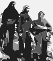 This is a black and white photograph of three people standing next to each other. They are all dressed in dark clothing, giving the impression that they might be nuns or monks. Each person has their hands on their hips, creating an interesting visual effect. In the background, there is a motorcycle parked near the right side of the image. The overall atmosphere of the photograph suggests a sense of unity and camaraderie among the individuals in the picture.