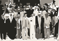 This is a black and white photograph of a group of people standing together. There are at least 13 individuals in the picture, all dressed in suits and ties. They appear to be attending an event or gathering, possibly a conference or formal occasion. Some of the men are wearing hats, adding to the vintage feel of the photograph. The people are standing close together, creating a sense of unity and camaraderie among them.