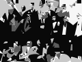 This is a black and white photo of a group of people standing together. There are at least 13 individuals in the picture, all dressed in suits and ties. They appear to be posing for a photograph or attending an event. Some of them are wearing ties that can be seen clearly, while others have their ties blurred out. The group is standing close together, creating a sense of unity and camaraderie among the members.