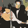 This features two men standing next to each other, both wearing ties. One of the men is positioned on the left side of the frame while the other man is on the right. They appear to be dressed in formal attire and are possibly posing for a picture. The background of the image has a blurry appearance, giving it an artistic or vintage feel.