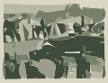This is a black and white photo of an outdoor scene with several tents set up. There are at least five tents visible in the picture, each varying in size and position. Some tents are located closer to the foreground while others are further back in the scene. In addition to the tents, there is a person standing near the center of the image, possibly observing or attending to one of the tents. The overall atmosphere of the photo suggests an outdoor gathering or event taking place under the tents.