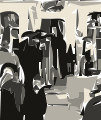 This is a black and white photo of several people standing in a room. There are at least nine individuals visible, with some closer to the foreground and others further back in the scene. They appear to be engaged in conversation or waiting for something. The room has various furniture items such as chairs and dining tables scattered throughout the space. A total of five chairs can be seen, with one near the left side of the image, another closer to the center, and three more towards the right side. There are also four dining tables in the scene, with two located on the right side and two others placed further back in the room. The presence of these furniture items suggests that this could be a gathering or event taking place within the space.
