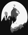 This features a silhouette of a person, possibly a woman or a man, sitting on a chair. The figure is positioned in the center of the scene and appears to be looking upwards. The background consists of a moon, which adds an interesting element to the composition. The overall atmosphere suggests that this could be a black and white photograph or a drawing with a focus on the subject's silhouette.