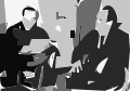 This is a black and white photograph of two men sitting in chairs, engaged in conversation. One man is on the left side of the frame, while the other is on the right. They appear to be discussing something important or sharing ideas with each other. The room they are in has a dining table located near the center of the image, and there are two chairs placed around it. A book can also be seen resting on the table, possibly providing them with reference material for their discussion. The overall atmosphere suggests that this could be a professional or academic setting where ideas are exchanged and debated.
