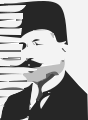 This is a black and white portrait of a man wearing a suit, tie, and hat. He appears to be an older gentleman with a mustache and goatee. The photo has been edited to create the illusion that he is standing in front of a piano keyboard, giving the impression that he might be a musician or performer. The image itself is not a painting but rather a manipulated photograph, which adds a unique touch to the portrait.