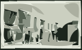 This is a black and white photo of an office space with several people present. There are at least five individuals in the scene, some standing closer to the foreground while others are further back. A person can be seen sitting on a chair near the center of the room. The office space features multiple chairs scattered throughout the area, as well as a dining table located towards the right side of the room. There is also a TV mounted on the wall in the background. The overall atmosphere appears to be that of an old-fashioned workplace or public building.