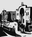 This is a black and white photo of an old building, possibly a church or a government building. It features a large archway with two windows on either side, giving the impression that it's a grand entrance to the structure. There are also several smaller windows visible throughout the scene, adding to the architectural details of the building. The black and white nature of the photo adds an artistic touch to the image, emphasizing the contrast between light and shadow.
