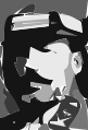 This is a black and white photo of a man wearing a hat. He appears to be looking down, possibly at the camera or something else in his line of sight. The man's face is partially obscured by shadows, giving him an air of mystery. The photograph has been edited to create a silhouette effect, emphasizing the contrast between light and shadow. This artistic choice adds depth and interest to the image, making it visually appealing.