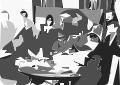 This is a black and white photograph of several people sitting around a dining table. There are five individuals in total, with one person on the left side of the table, two people on the right side, and another person at the far end of the table. They appear to be engaged in conversation or enjoying each other's company. The dining table is set with various items such as cups, bowls, a knife, and a spoon. There are three cups placed around the table, one near the left side, another at the center, and the third on the right side. Two bowls can be seen, one in the middle of the table and the other towards the right end. A knife is located close to the center of the table, while a spoon rests near the right edge. The overall atmosphere suggests a social gathering or meal among friends or family members.