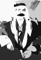 This features a man with long hair and a beard, wearing a black suit. He appears to have a moustache and is looking downward, possibly in deep thought or contemplation. The man's attire suggests that he may be dressed for an important event or occasion. The overall atmosphere of the image seems somewhat mysterious, with the man's facial expression adding to this feeling.