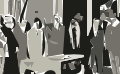 This is a black and white photo of several people standing in a room. There are at least nine individuals visible, with some standing closer to the foreground while others are further back. They appear to be engaged in conversation or waiting for something. In the center of the scene, there is a dining table surrounded by chairs. A handbag can also be seen placed on the floor near one of the people. The overall atmosphere suggests that this gathering could be related to a business meeting or social event.