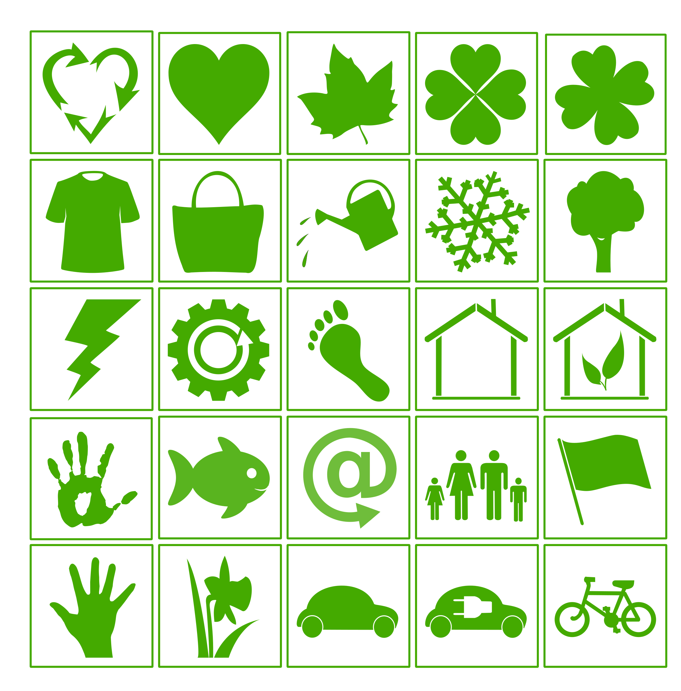This features a collection of green icons, including various symbols and images. Among the icons are a car, bicycle, fish, house, tree, and several other objects. These icons are arranged in a grid-like pattern, with each icon occupying its own square. The variety of icons suggests that they could be used for different purposes or to represent diverse concepts related to eco-friendly living or sustainable practices.