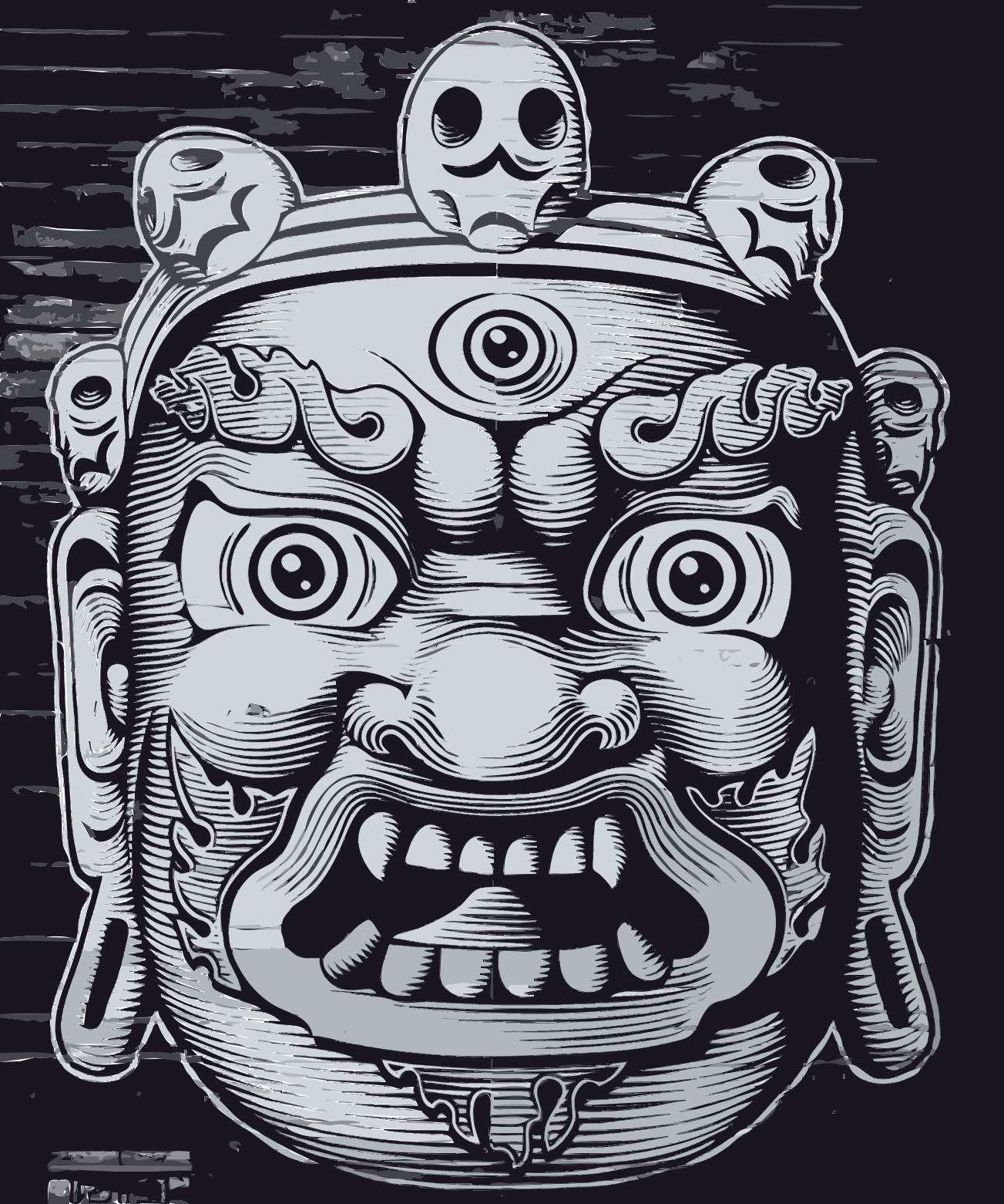 This features a large, intricately designed mask with an angry expression. It is adorned with multiple eyes and has a crown-like structure on top of its head. The mask appears to be made from metal or another sturdy material, giving it a strong presence in the scene. The design suggests that this mask might have been used for ceremonial purposes or as an artistic display. Overall, the mask exudes a sense of power and authority, making it an impressive centerpiece in its setting.
