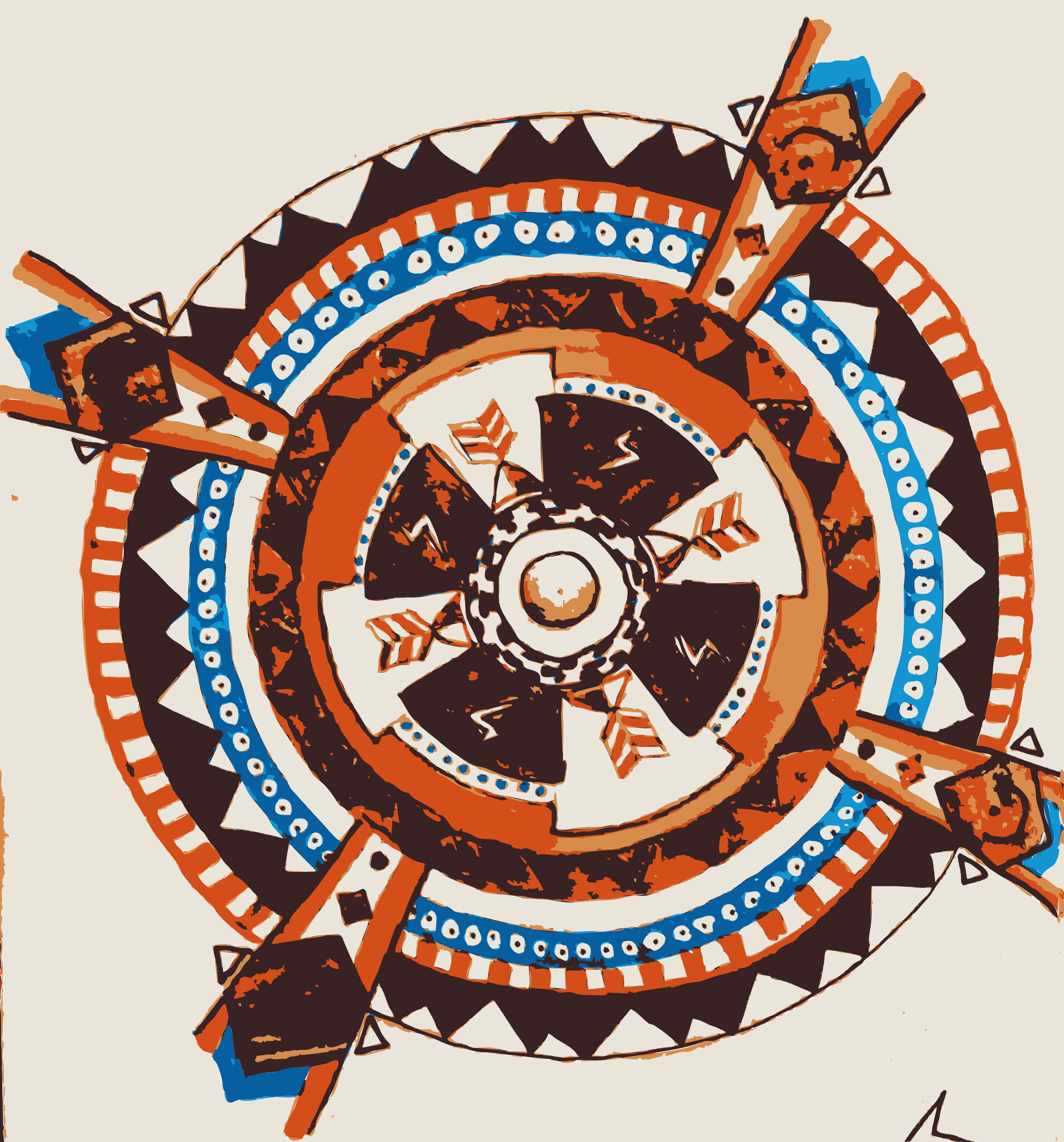 This features a colorful and intricate design, likely inspired by Native American art. It is an orange and blue mandala with a central circle that appears to be the sun. The mandala has various geometric shapes surrounding it, including triangles and diamonds. These shapes are arranged in a circular pattern, creating a visually appealing and complex design. The combination of colors and patterns gives the image a vibrant and lively appearance, making it an interesting piece of art or decoration.