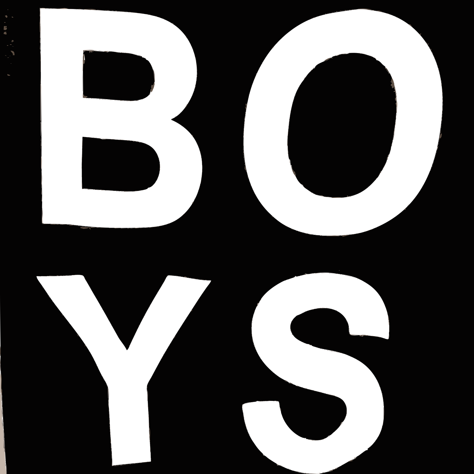 This is a black and white sign that reads "BOYS!" in large, bold letters. The sign appears to be an advertisement or promotional material for something related to boys. The use of all caps and the contrasting colors make it easy to read and noticeable from a distance. The simplicity of the design allows the message to stand out clearly without any distractions or unnecessary elements, making it effective in conveying its intended purpose.