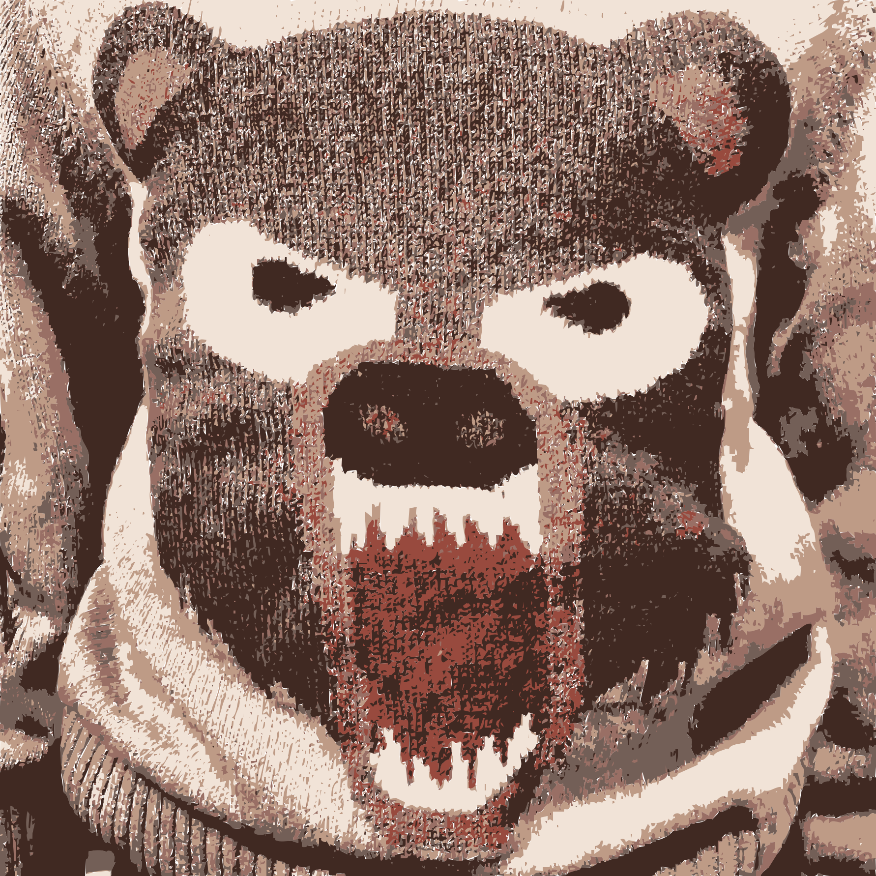 This features a brown and white stuffed animal, possibly a teddy bear or a dog, with its mouth wide open. It appears to be wearing a sweater that has been digitally altered to give it an angry expression. The sweater is designed in such a way that the animal's teeth are visible through its mouth, adding to the aggressive appearance of the stuffed animal. This unique design choice creates a striking contrast between the innocent and playful nature of a stuffed animal and the menacing expression it has been given.