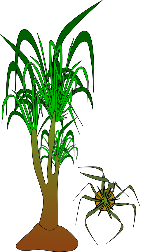 This features a large plant with green leaves and a brown trunk. It appears to be an artistic representation of the plant, possibly in a 3D or graphic style. The plant is positioned towards the left side of the frame, while another smaller plant can be seen on the right side. This second plant has a more elongated shape compared to the main plant and seems to be growing out of the ground. Overall, the image showcases an interesting perspective on these two plants in their natural environment.
