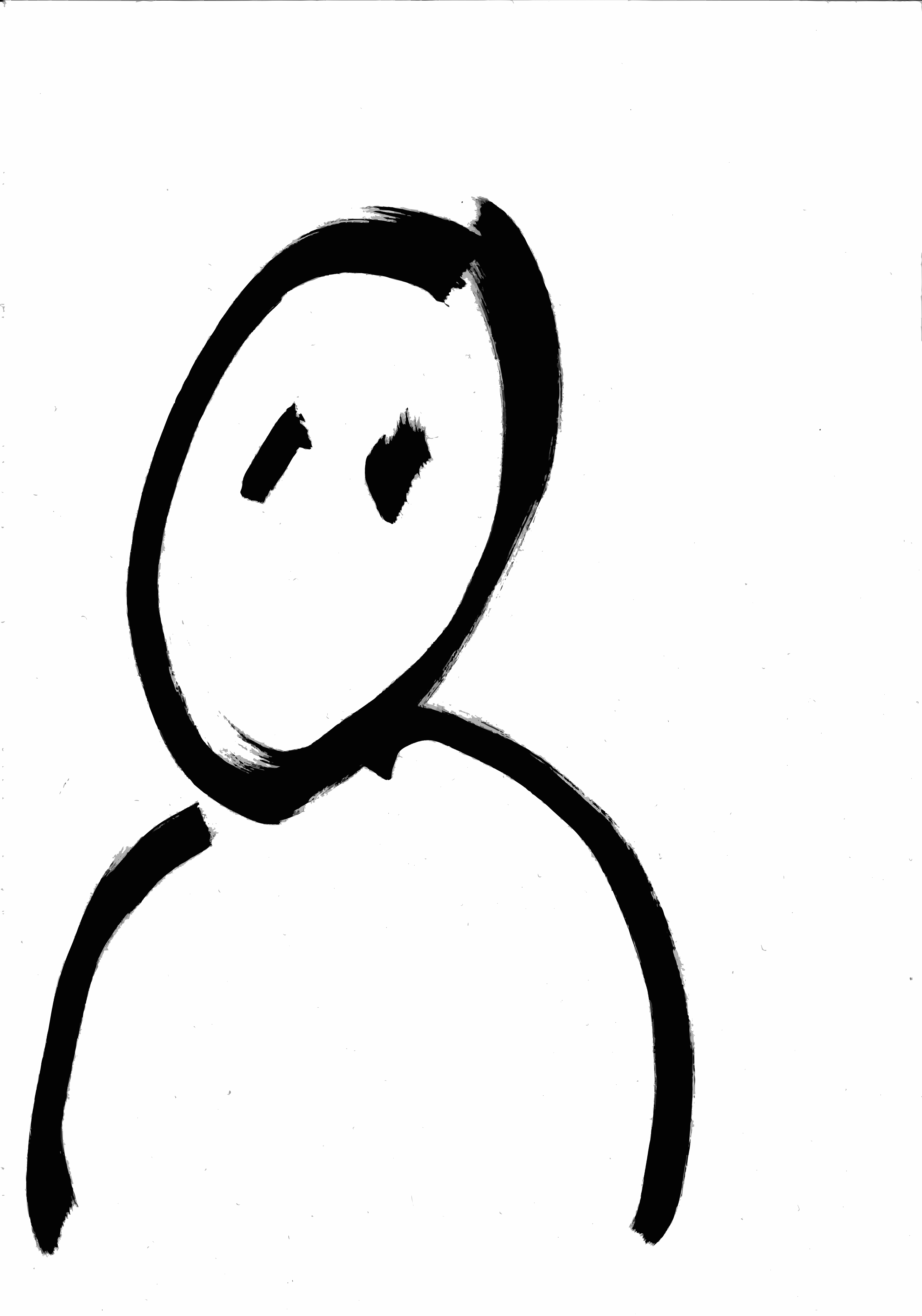 This features a black and white drawing of a person's head, with the face appearing to be frowning. The eyes are open, giving the impression that the person is looking at something or someone. The drawing has been created using a black pen, which adds depth and contrast to the overall composition. The sketch captures the essence of a human figure, showcasing its facial features and expression in a simple yet effective manner.