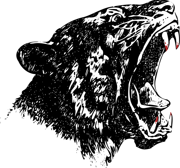 This features a large black and white drawing of a mouth with teeth, resembling the open mouth of a bear. The mouth is wide open, displaying its sharp teeth in an intimidating manner. The teeth are spread out across the mouth, creating a sense of depth and dimension to the drawing. This artistic representation captures the essence of a powerful animal's jaw, showcasing its strength and fearsome appearance.