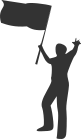 This features a silhouette of a man holding up a flag. He is standing in the foreground, with his arms raised high above his head, giving an impression of triumph or celebration. The flag he holds appears to be black and white, adding contrast to the scene. The overall composition of the image creates a sense of movement and energy, as if the man is actively engaging with the flag in some way.