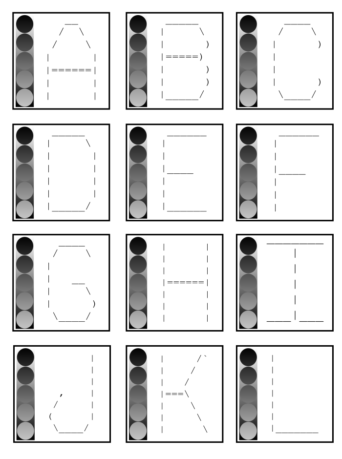 This features a collection of twelve different drop caps, each representing the first letter of the alphabet. These drop caps are designed in an ASCII art style and are arranged in a grid pattern on a white background. They can be used to add a unique and retro touch to documents or other projects that require attention-grabbing initials. The individual letters include A, B, C, D, E, F, G, H, I, J, K, L, M, N, O, P, Q, R, S, T, U, V, W, X, Y, and Z.