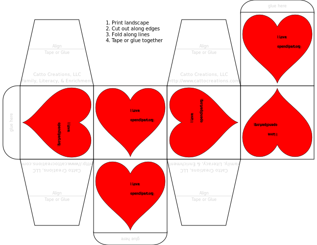 This features a blueprint for a heart cube, with each side of the cube having a red heart shape. The hearts are arranged in such a way that they form a larger heart when combined. The blueprint is accompanied by an instruction text at the top of the image, likely providing guidance on how to assemble or construct the heart cube using the provided pieces. This could be a useful tool for those interested in creating their own heart-shaped objects or decorations.