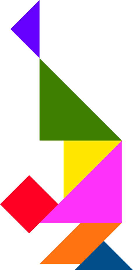 This features a colorful tangram made up of various shapes. It is displayed in different colors, including red, green, yellow, blue, and orange. These vibrant colors create an eye-catching pattern that resembles a human figure. The tangram's design showcases the creativity and artistry involved in creating such intricate patterns using simple geometric shapes.