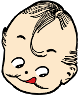 This features a cartoon drawing of a baby with a big smile on its face. The baby's head is the main focus, and it appears to be looking at something or someone off-camera. The baby has black hair, which adds to the overall cuteness of the character. The drawing itself is in black and white, giving it an old-fashioned feel. Overall, this image captures a playful and innocent moment with a cute baby character.