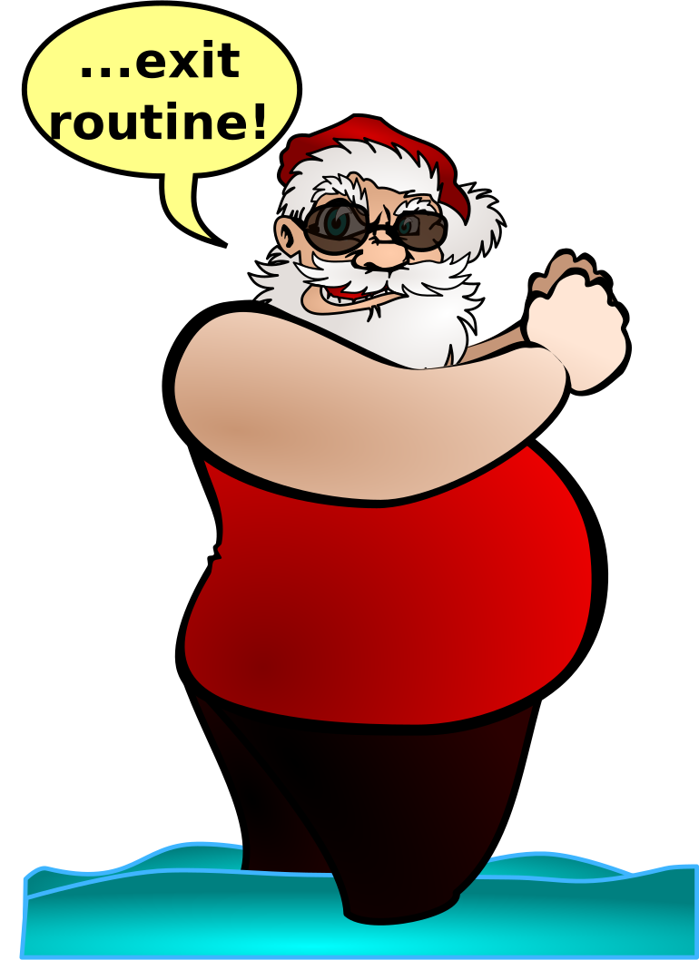 This features a cartoon Santa Claus in a red shirt and black shorts, standing on the beach. He is wearing sunglasses and appears to be enjoying his time at the beach. Above him, there is a speech bubble with a message that reads "Exit Routine!". The image seems to convey a lighthearted and humorous take on Santa Claus's life outside of the holiday season.