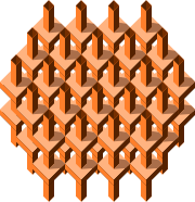 This features a three-dimensional geometric composition of numerous small brown wooden blocks. These blocks are arranged in various shapes and sizes, creating an intricate pattern that fills the entire frame. The arrangement of these blocks gives off a sense of depth and complexity, making it an interesting visual piece. The combination of different shapes and sizes adds to the overall appeal of this artistic composition.